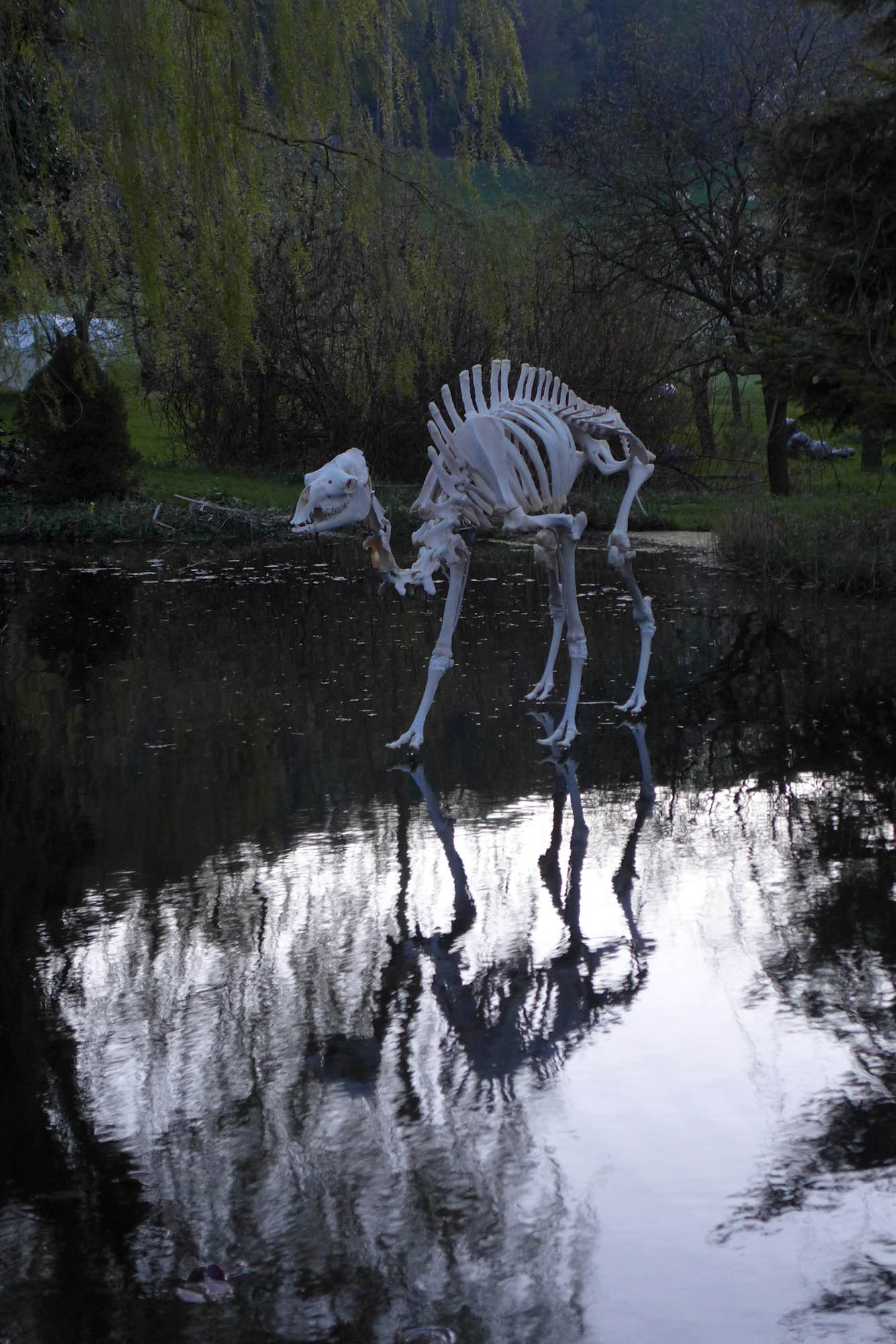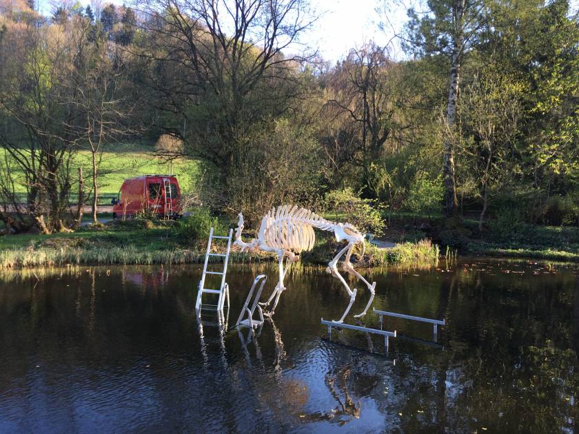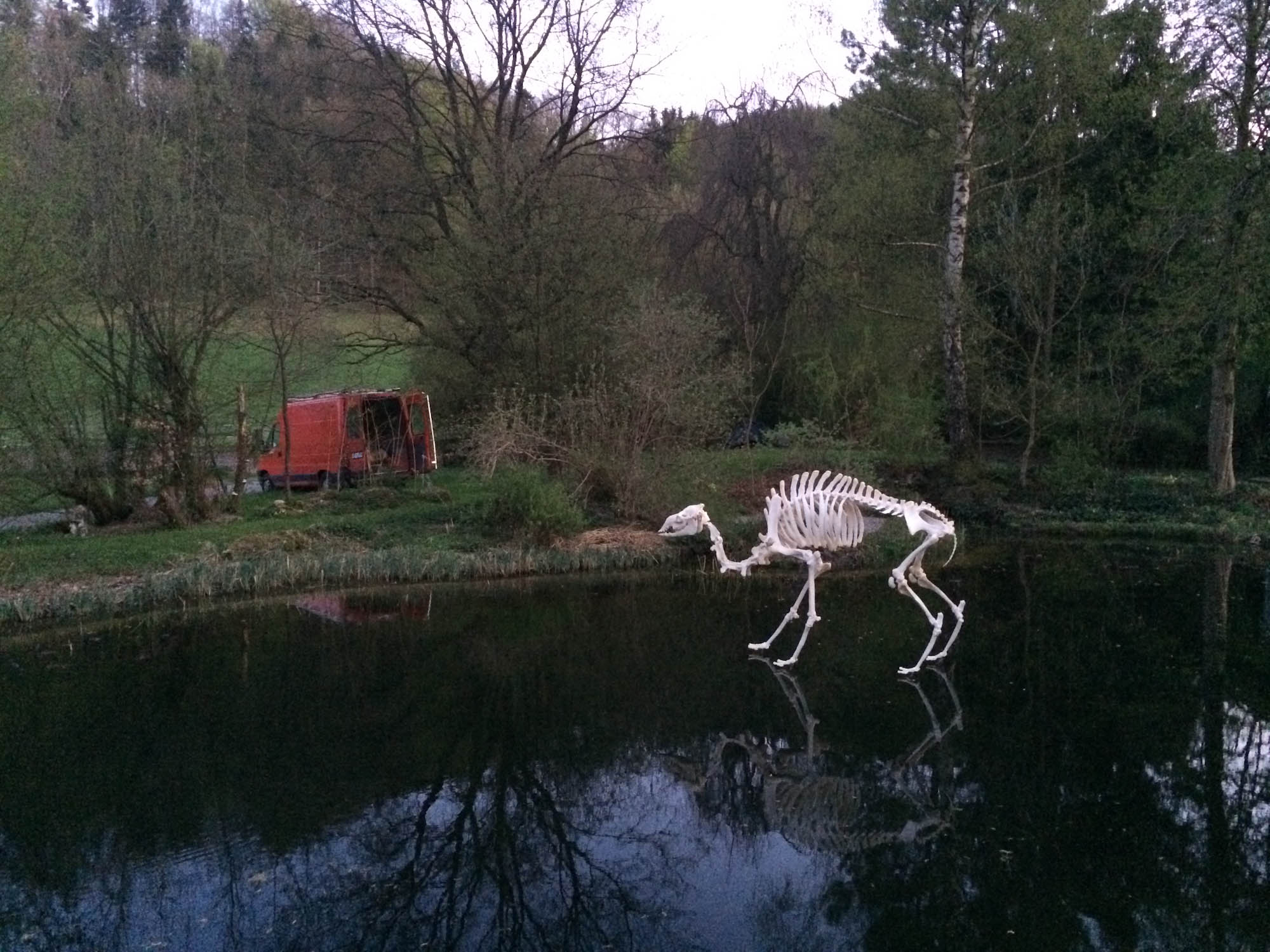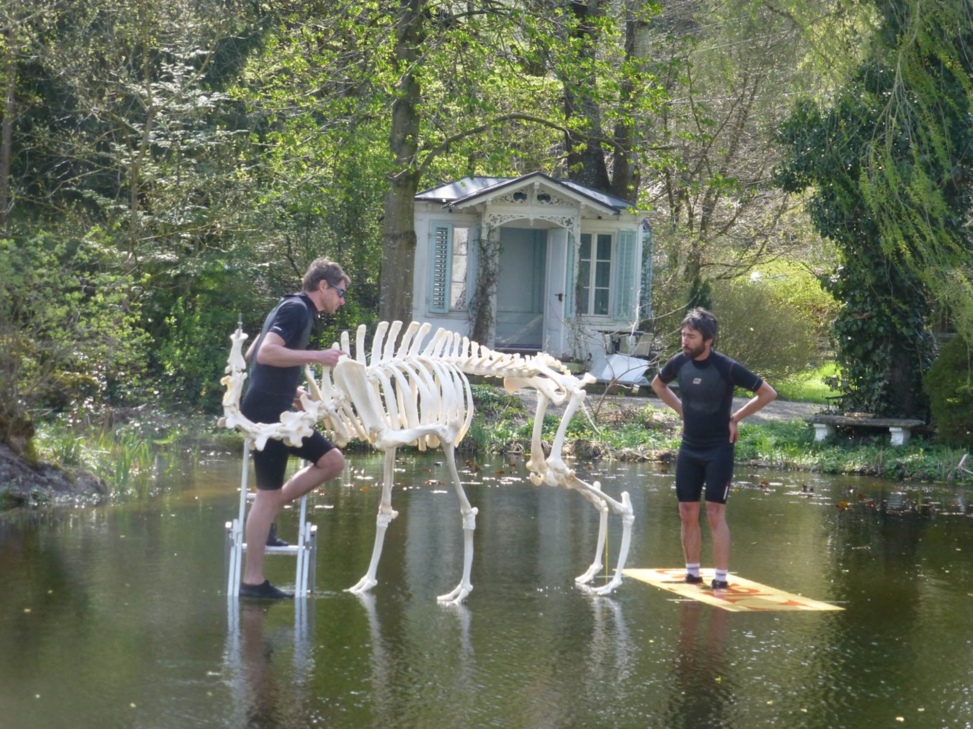 Fata Morgana contains every element of the classical oasis: the sun, the pond, the kamel and the skeleton. But in this installation of Christian Gonzenbach, nothing holds in its correct place. The kamel skeleton is walking on water...