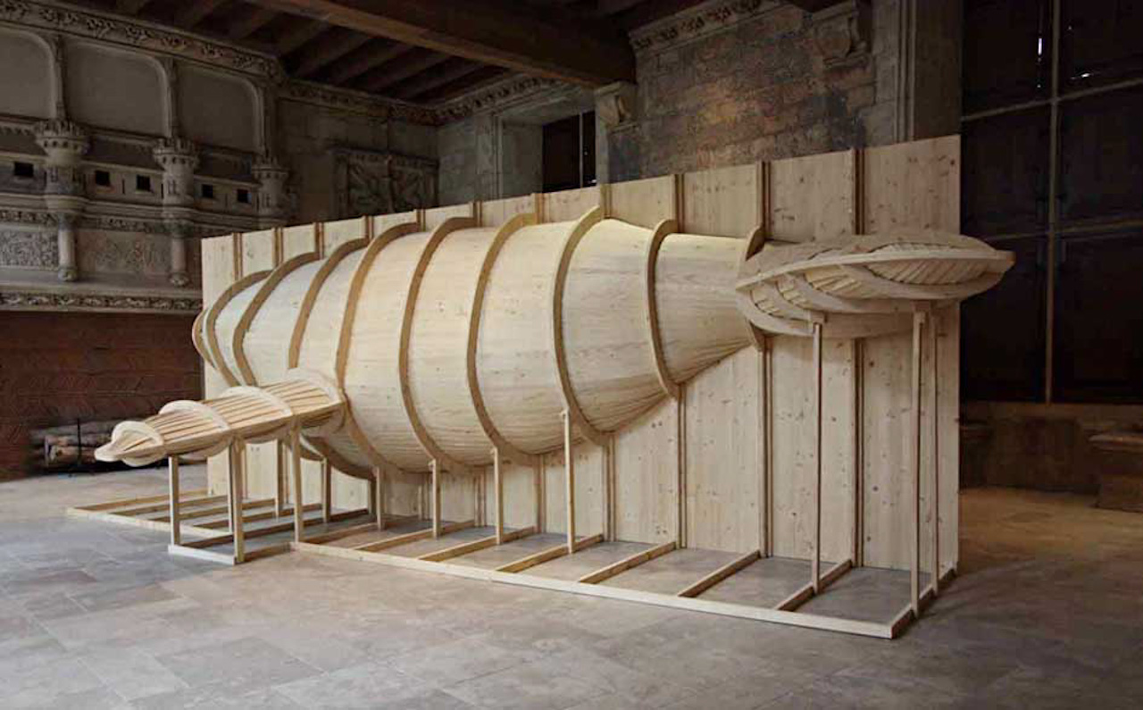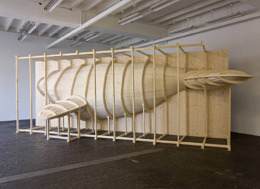 Hval, Scandinavian word for whale, is a 3D installation that approximates the scaffolding of shipbuilding. Consisting mainly of vacuum left by the body of whale that has disappeared, this scale-to-life sculpture blurs the line between the prey and the predator. The ship side is made of light wood in strict geometric fashion whereas the dark opposite side reveals more organic form accentuated by the black hole, which is whale’s pectoral fin on the positive side, creating a striking visual impact.