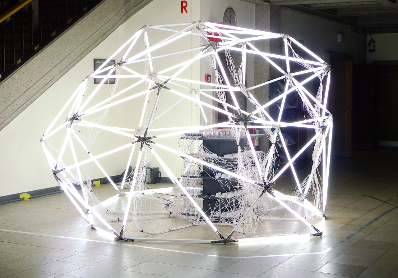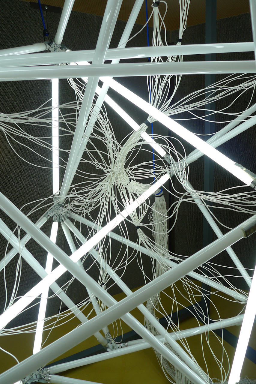 Quarc stands for Quantum Art Cloud. The igloo-like construction is made of a hundred standard fluorescent tubes connected by 1.5 km of cables. At the center of this device is a “mother brain” built with magnets and disks that has been designed to illuminate the tubes in a random sequence. Antithetically, as sophisticated and technically labored as it is, this work reflects a controlled situation in which unpredictability is the motivation behind a predictable mechanism.