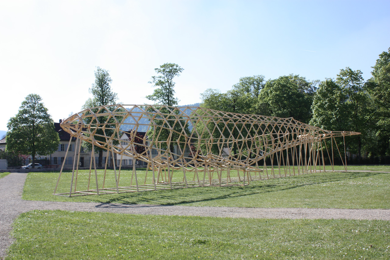 This work is the same as Life Size, however, once installed outdoors, having its gigantic skeletal form filled in by air, the underwater mammal becomes a man-made bird, hence the name Zepplin.