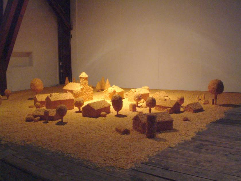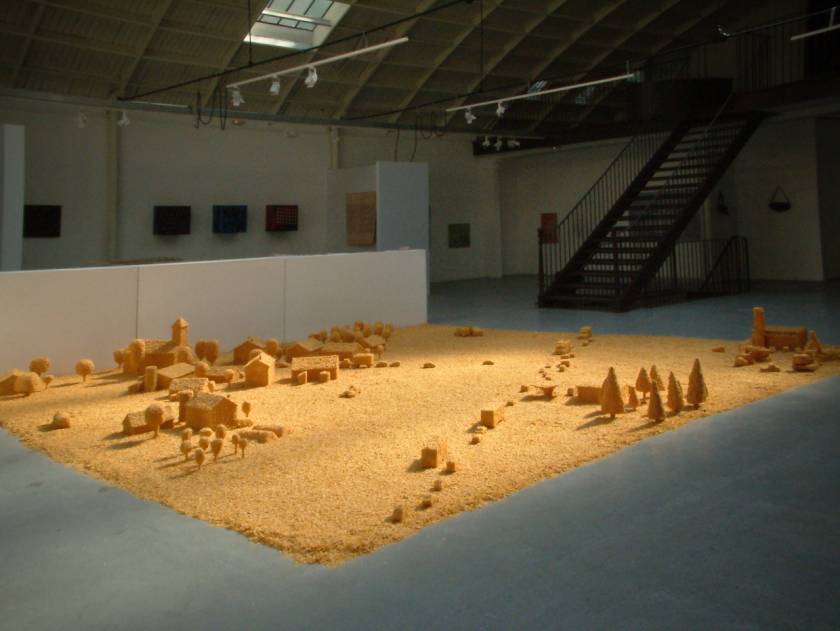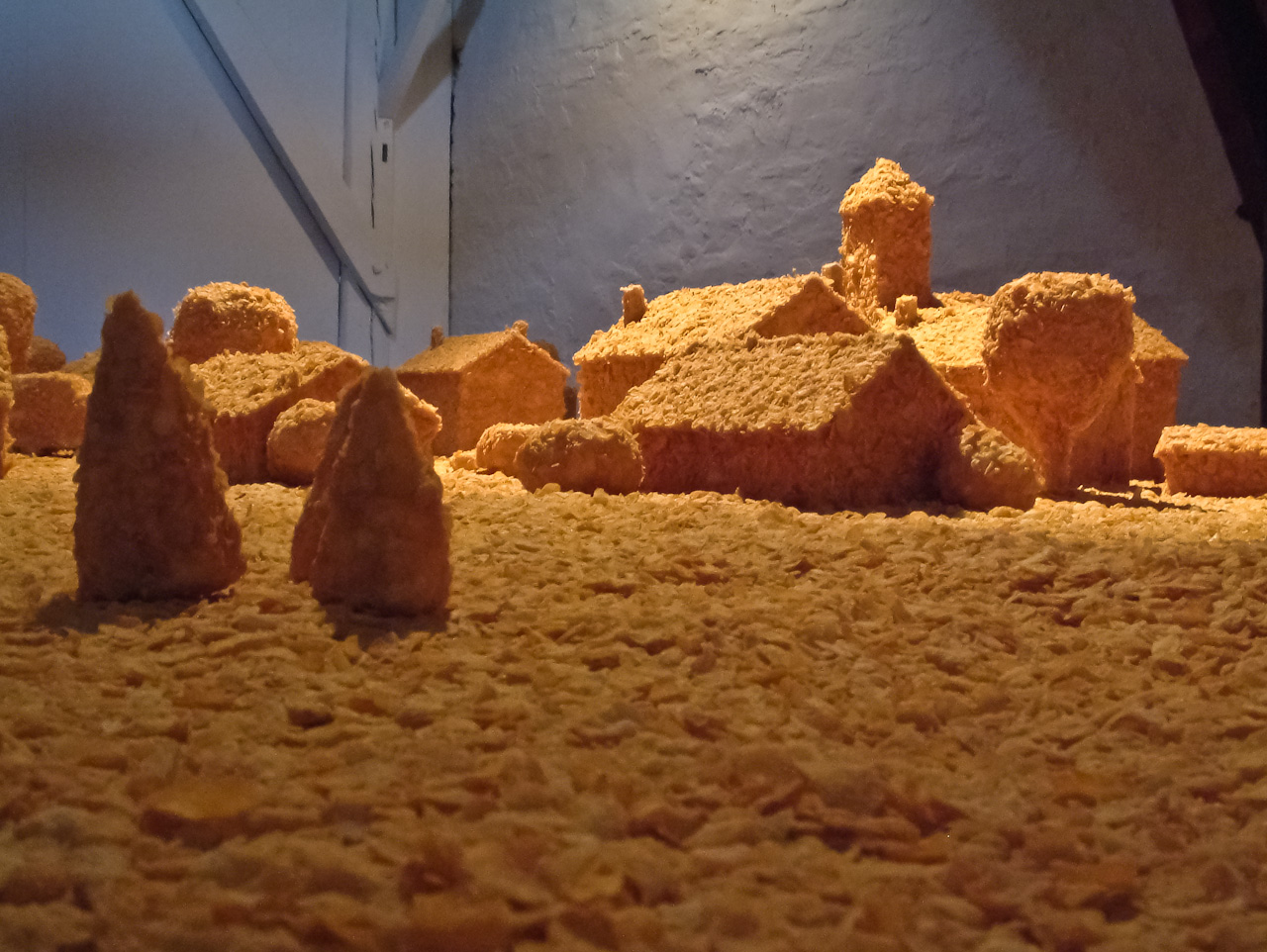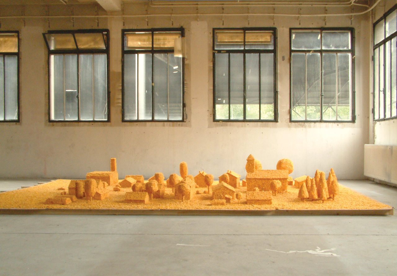 Prenant le contrepied de l’interdiction de jouer avec la nourriture, Flakes Town est une installation monochrome réalisée en pointillés de cornflakes. Est-il préférable de boire dans un verre biodégradable fabriqué à partir de maïs ou de construire un village imaginaire à partir de 300 kilogrammes de céréales ? Flakes Town souhaite soulever ces questions sans se trop s’éloigner de l’univers du conte de Hansel et Gretel qui avaient découvert une maison en pain d’épices avec des fenêtres en sucre