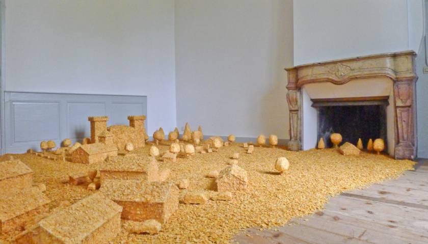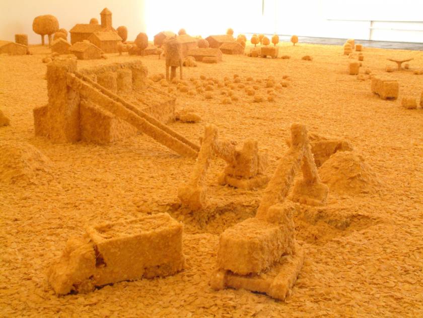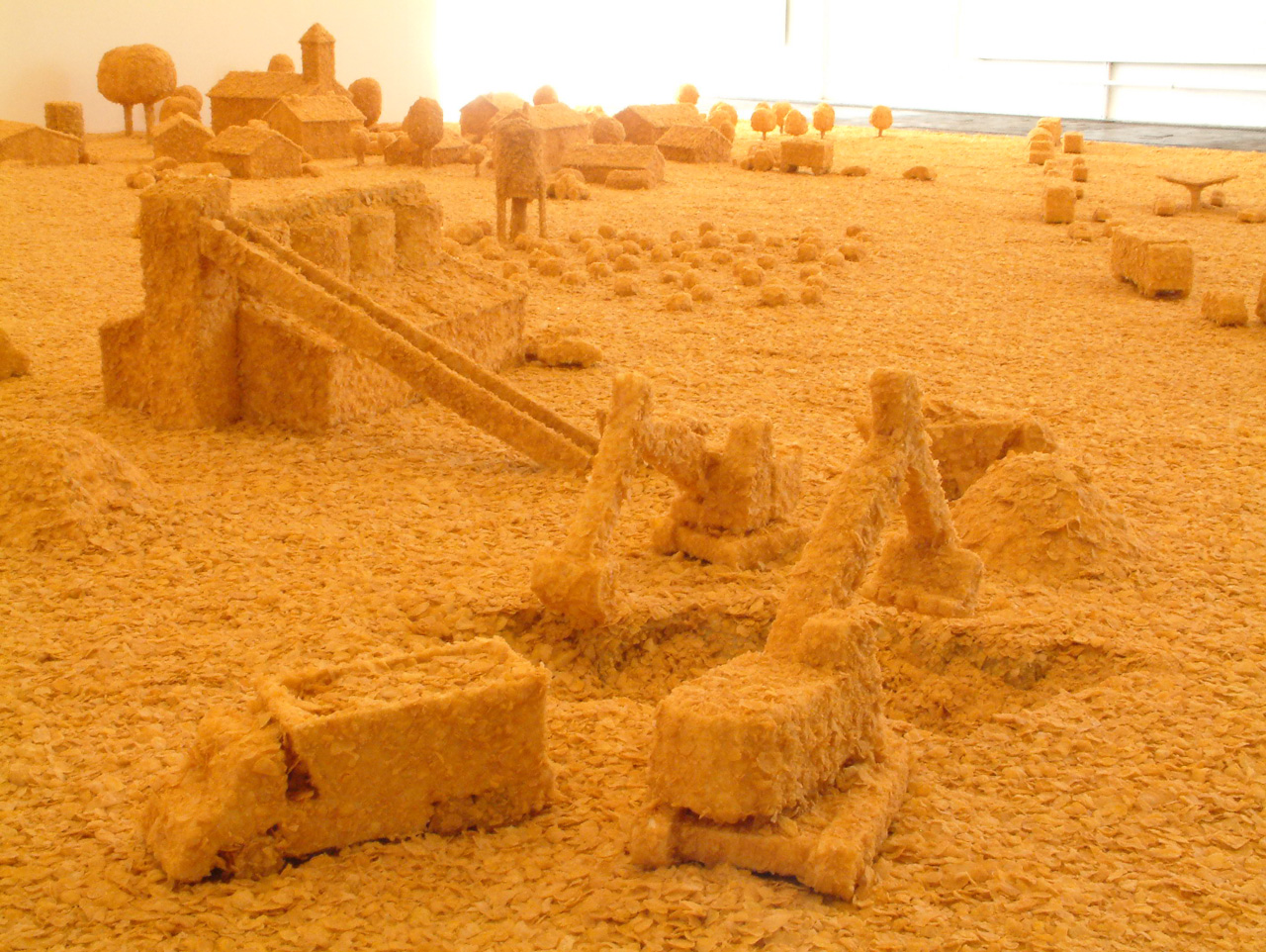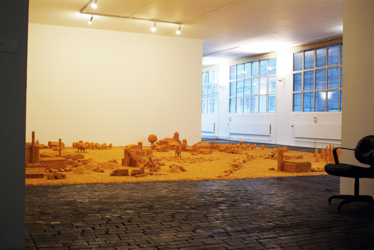 Prenant le contrepied de l’interdiction de jouer avec la nourriture, Flakes Town est une installation monochrome réalisée en pointillés de cornflakes. Est-il préférable de boire dans un verre biodégradable fabriqué à partir de maïs ou de construire un village imaginaire à partir de 300 kilogrammes de céréales ? Flakes Town souhaite soulever ces questions sans se trop s’éloigner de l’univers du conte de Hansel et Gretel qui avaient découvert une maison en pain d’épices avec des fenêtres en sucre