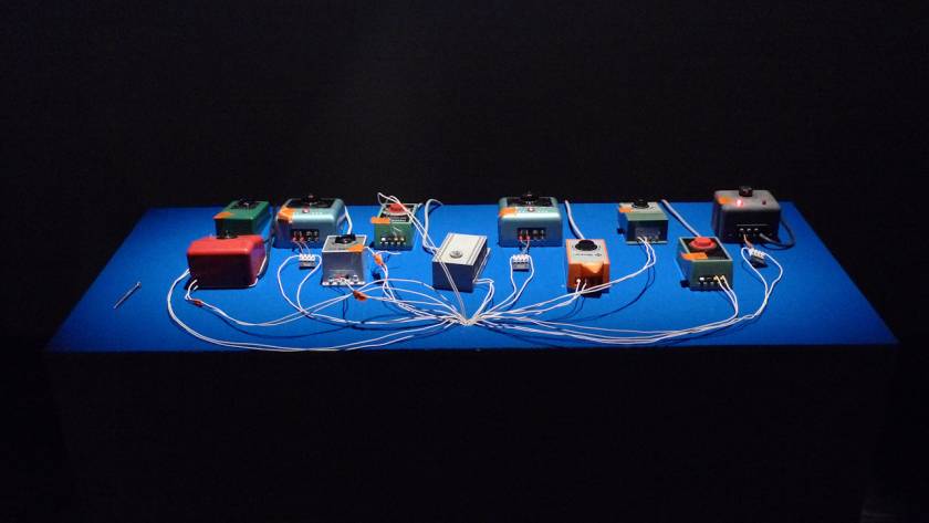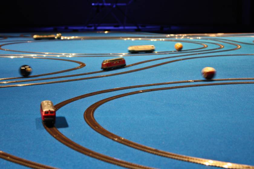 Le Momentum – autrement dit le mouvement des particules – est représenté dans ce dispositif par une douzaine de circuits de trains électriques. Avec des couleurs assorties entre elles et se référant au jeu du billard, chaque locomotive pousse une boule. Il en résulte un effet hypnotique du fait des courses poursuites qui se créent entre les locomotives et leur balle. Une manière d’illustrer le mouvement des atomes qui interfèrent entre eux dans des entrelacs d’orbitales.