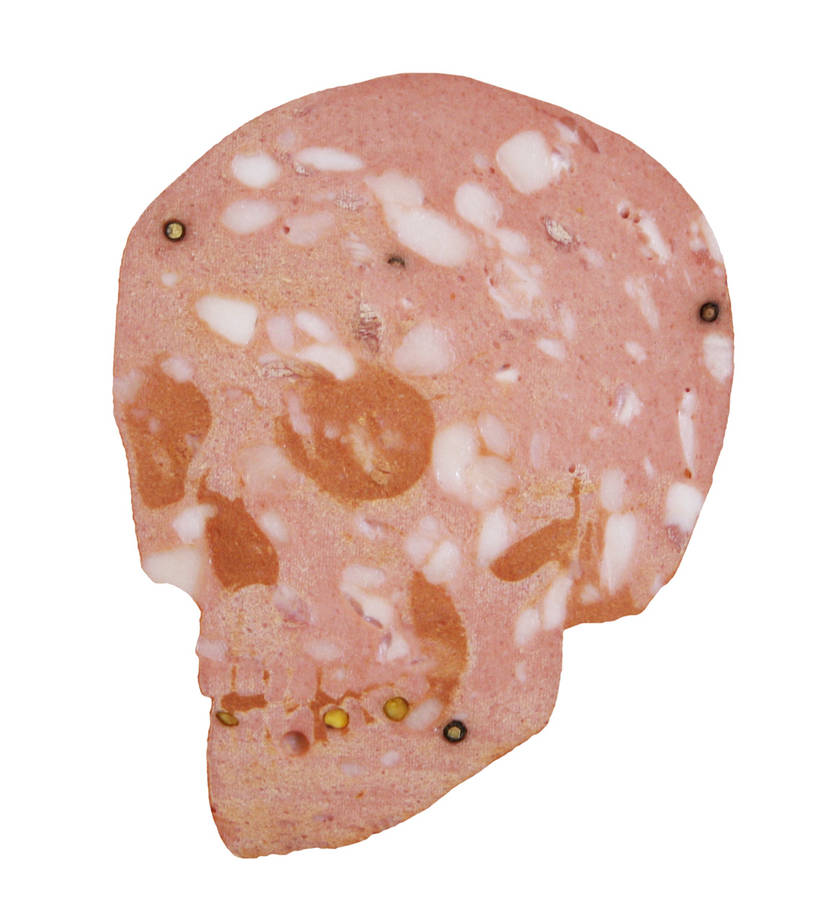 En vanité ultime, Mortadella est, comme son titre l’indique, faite de chair recomposée pour dessiner un crâne humain. L’image d’un crâne a été gravée au laser sur une vraie tranche de mortadelle de plusieurs centimètres d’épaisseur. La pièce de charcuterie italienne est pérennisée par une photographie laminée sous plexiglas.