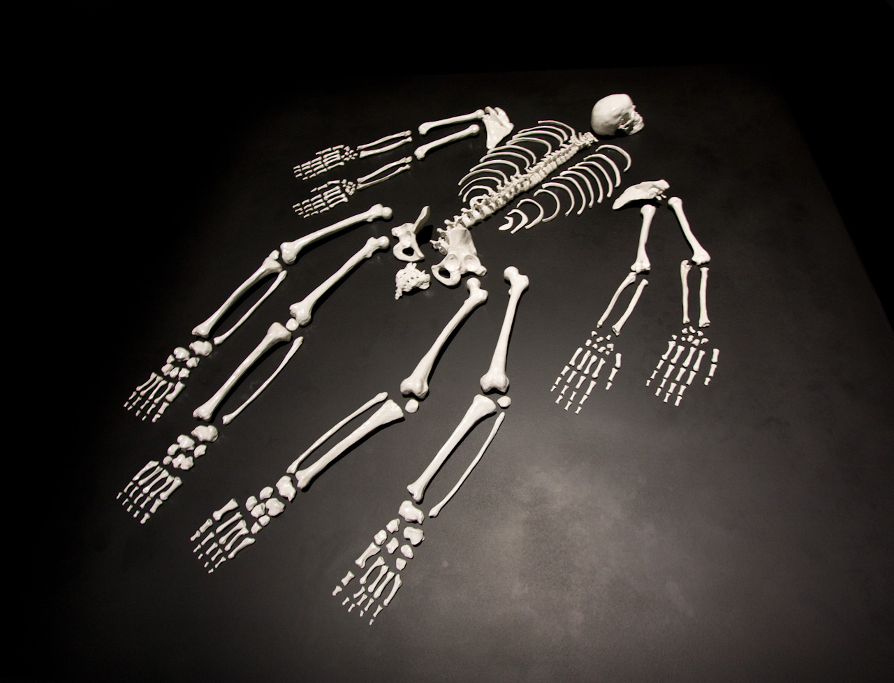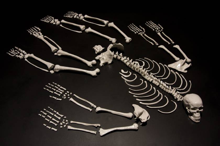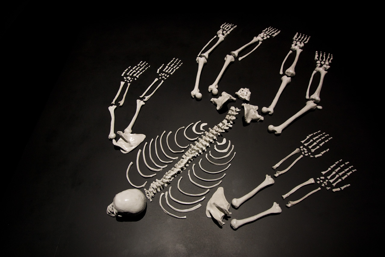Toutes les pièces de Sapiens Sapiens ont été moulées à partir d’un réel squelette humain, à cela près que les omoplates et les hanches ont été conçues pour que Sapiens Sapiens puisse avoir quatre bras et quatre jambes. Mais que ferions-nous de tous ces membres supplémentaires ? Réalisées en porcelaine émaillée et nacrée, ces pièces ne nous mentent ainsi pas sur la fiction qu’elles racontent tout en questionnant la théorie de Darwin. Le squelette est mis à plat, tel un animal rampant ou un cafard, ce qui n’est pas sans faire écho à La Métamorphose de Franz Kafka.