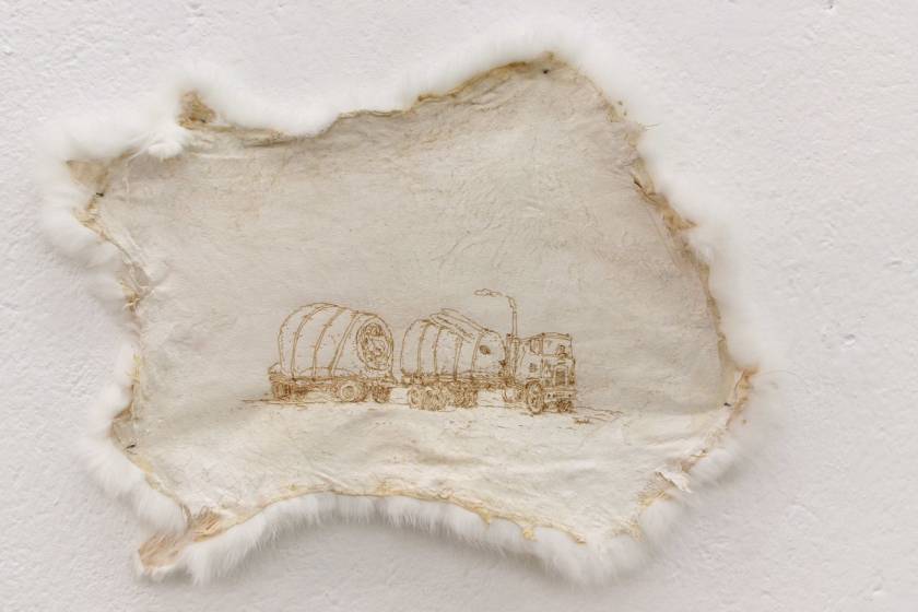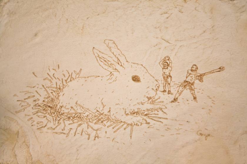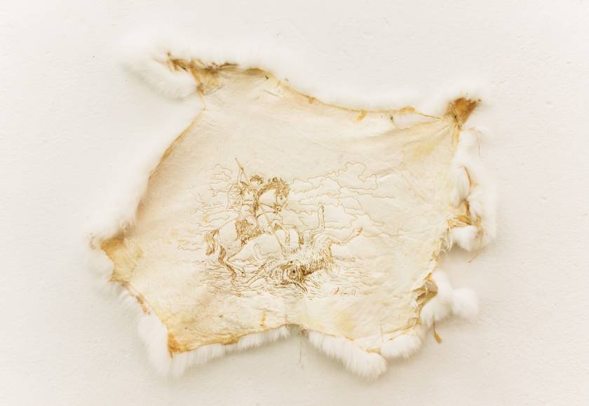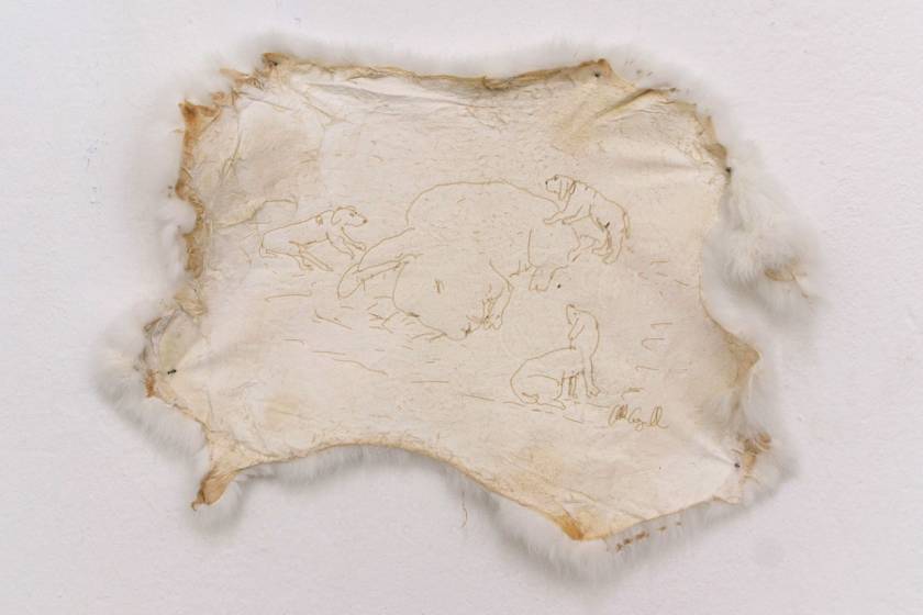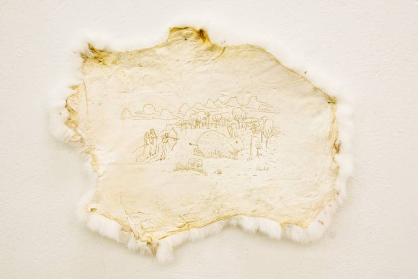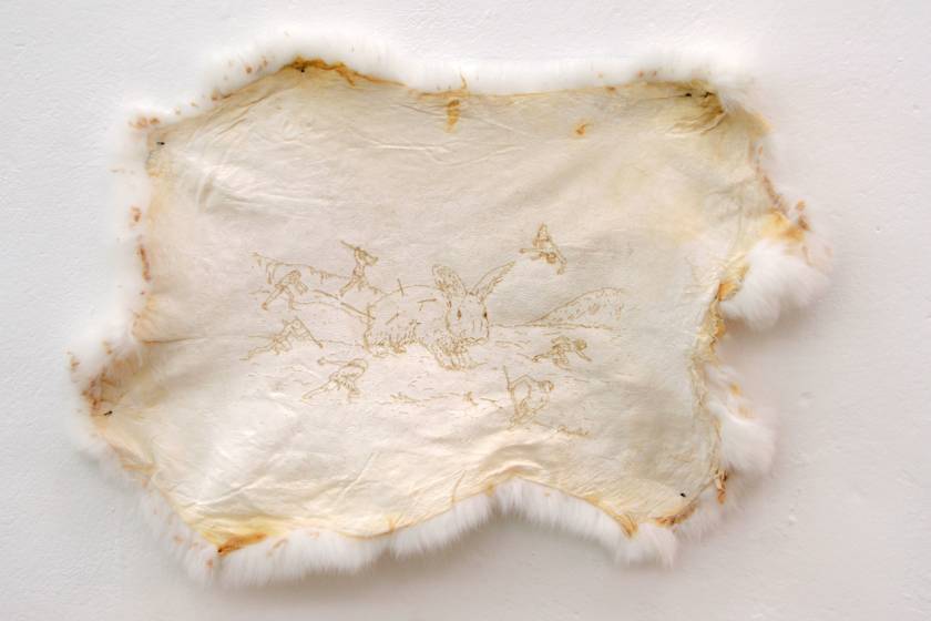 Skintales est une série de dessins gravés sur des peaux de lapin qui, comme tirés d’un conte, racontent les scènes de la vie d’un grand lapin. La narration se découvre comme autant de tatouages qui préexisteraient au dépeçage du gigantesque léporidé. Cette série est en effet indissociable du Great Stuffed Rabbit. Elle est présentée dans un accrochage linéaire et la fourrure blanche qui encadre les peaux contribue à leur donner un petit aspect aérien rêvé.
